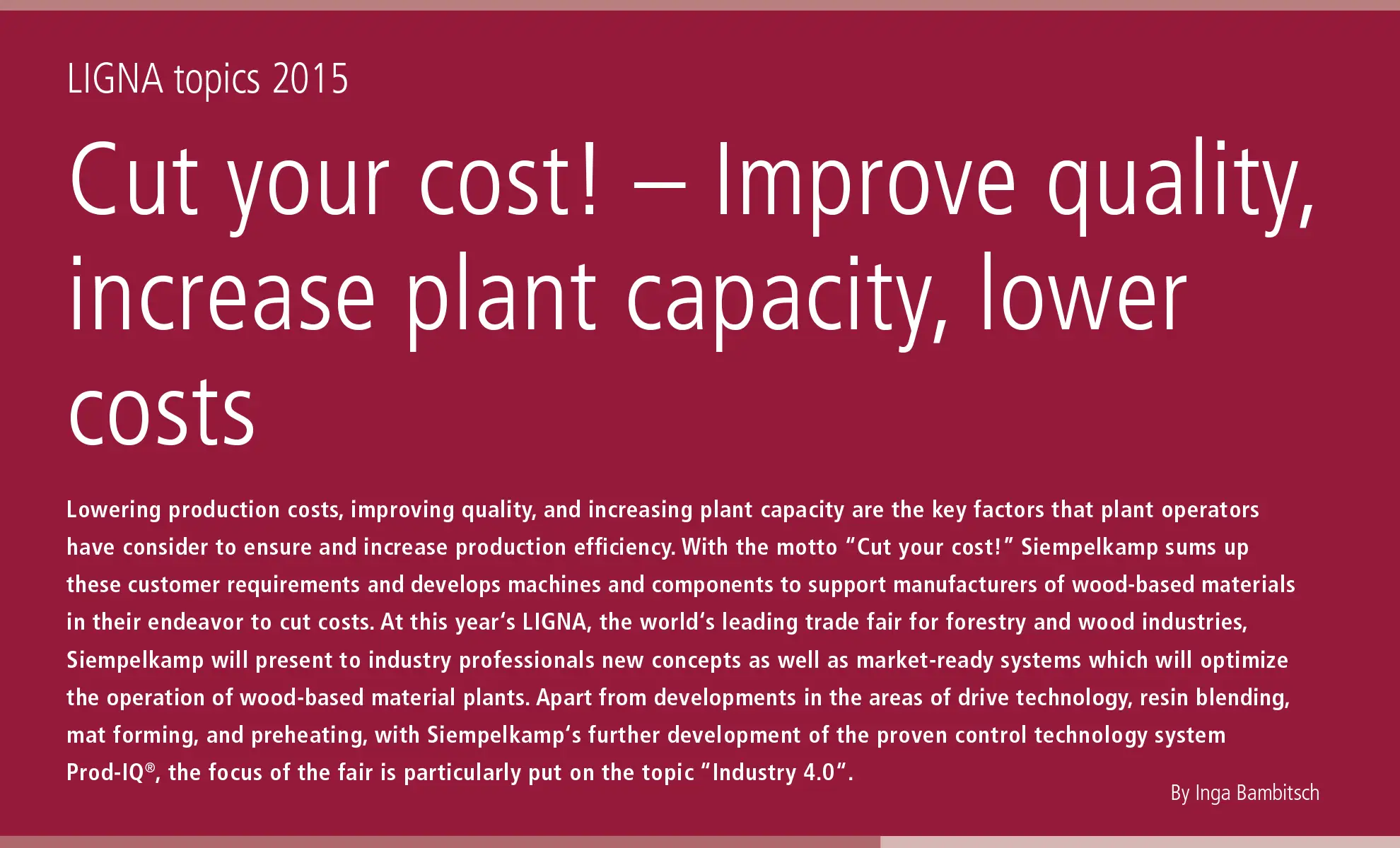 Lowering production costs improving quality, and increasing plant capacity are the key factors that plant operators have consider to ensure and increase production efficiency. With the motto “Cut your cost!” Siempelkamp sums up these customer requirements and develops machines and components to support manufacturers of wood-based materials in their endeavor to cut costs. At this year’s LIGNA, the world’s leading trade fair for forestry and wood industries, Siempelkamp will present to industry professionals new concepts as well as market-ready systems which will optimize the operation of wood-based material plants. Apart from developments in the areas of drive technology, resin blending, mat forming, and preheating, with Siempelkamp’s further development of the proven control technology system Prod-lQ@, the focus of the fair is particularly put on the topic “Industry 4.0”.