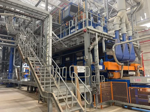 SL wind chamber: the two surface layers are formed in a wind forming process with the finest particles placed in the outer surface layers and the particle size gradually increasing towards the board core. “EcoFormer SL” (patented) represents an evolution of the traditional wind forming concept: it enables optimized wood separation of the finer and coarser, a more uniform and stable cross-weight distribution, easier maintenance and cleaning, reducing the consumption of glue, wood and electrical power.